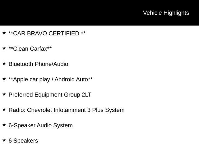 **CAR BRAVO CERTIFIED **, **Clean Carfax**, Bluetooth Phone/Audio, **Apple car play / Android Auto**, 4-Wheel Disc Brakes, 6 Speakers, 6-Speaker Audio System, 6-Way Manual Driver Seat Adjuster, 6-Way Manual Passenger Seat Adjuster, ABS brakes, Air Conditioning, Alloy wheels, Automatic temperature control, Brake assist, Dual front impact airbags, Dual front side impact airbags, Electronic Stability Control, Emergency communication system: OnStar and Chevrolet connected services capable, Front anti-roll bar, Front Bucket Seats, Front Center Armrest, Front wheel independent suspension, Knee airbag, Occupant sensing airbag, Overhead airbag, Power steering, Power windows, Preferred Equipment Group 2LT, Radio: Chevrolet Infotainment 3 Plus System, Rear side impact airbag, Rear window defroster, Rear window wiper, Remote keyless entry, SD Card Receptacle, Steering wheel mounted audio controls, Traction control, Variably intermittent wipers.