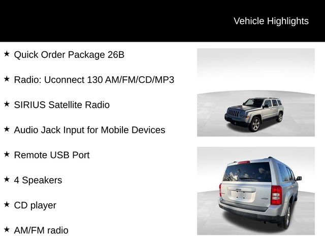 4WD, Dark Slate Gray Interior Cloth, 17" x 6.5" Aluminum Wheels, 4 Speakers, 4-Wheel Disc Brakes, ABS brakes, Air Conditioning, Alloy wheels, AM/FM radio, Anti-whiplash front head restraints, Audio Jack Input for Mobile Devices, Brake assist, Bumpers: body-color, CD player, Driver door bin, Driver vanity mirror, Dual front impact airbags, Electronic Stability Control, Four wheel independent suspension, Front anti-roll bar, Front Bucket Seats, Front Center Armrest w/Storage, Front fog lights, Front reading lights, Heated door mirrors, Heated front seats, Illuminated entry, Low tire pressure warning, Occupant sensing airbag, Outside temperature display, Overhead airbag, Panic alarm, Passenger door bin, Passenger vanity mirror, Power door mirrors, Power steering, Power windows, Premium Cloth Bucket Seats, Quick Order Package 26B, Radio: Uconnect 130 AM/FM/CD/MP3, Rear anti-roll bar, Rear window defroster, Rear window wiper, Rear-View Auto-Dimming Mirror w/Microphone, Remote keyless entry, Remote Start System, Remote USB Port, Roof rack: rails only, SIRIUS Satellite Radio, Speed control, Split folding rear seat, Steering wheel mounted audio controls, Tachometer, Tilt steering wheel, Traction control, Uconnect Voice Command w/Bluetooth, Variably intermittent wipers.