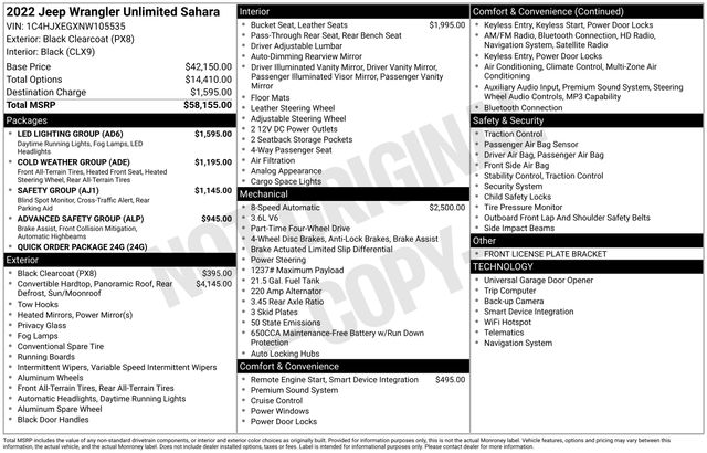 **Certified**, **Clean Carfax**, **4 Wheel Drive**, HEATED LEATHER SEATS, Wrangler Unlimited Sahara, 4D Sport Utility, 3.6L V6 24V VVT, 8-Speed Automatic, 4WD, Black Clearcoat, Black Leather, 3.45 Rear Axle Ratio, 4-Wheel Disc Brakes, ABS brakes, Advanced Brake Assist, Advanced Safety Group, Air Conditioning, Auto High Beam Headlamp Control, Automatic temperature control, Blind Spot & Cross Path Detection, Brake assist, Cloth Low-Back Bucket Seats, Cold Weather Group, Daytime Running Lamps LED Accents, Dual front impact airbags, Dual front side impact airbags, Electronic Stability Control, Emergency communication system: SiriusXM Guardian, Front anti-roll bar, Front LED Fog Lamps, Full Speed Forward Collision Warning Plus, Heated Steering Wheel, Heavy Duty Suspension w/Gas Shocks, Integrated roll-over protection, LED Lighting Group, LED Premium Reflector Headlamps, LED Taillamps, Low tire pressure warning, Navigation System, Occupant sensing airbag, ParkSense Rear Park Assist System, ParkView Rear Back-Up Camera, Power steering, Power Top Quarter Window Storage Bag, Power windows, Quick Order Package 24G (DISC), Rear anti-roll bar, Remote keyless entry, Remote Start System, Removable Rear Quarter Windows, Safety Group, Sky 1-Touch Power Top, Steering wheel mounted audio controls, Traction control, Variably intermittent wipers.