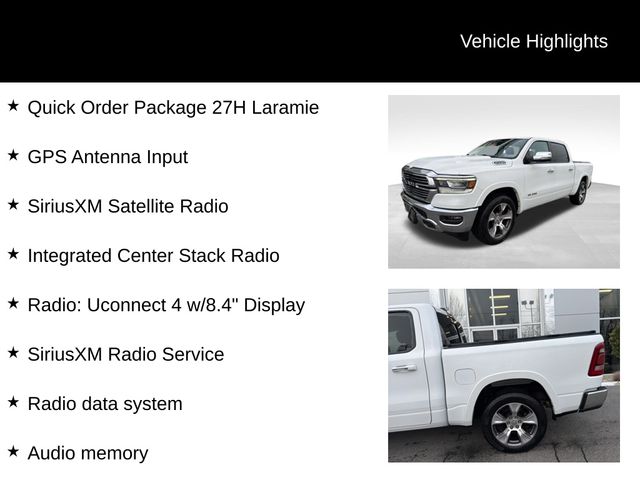 10 Speakers, 3 Rear Seat Head Restraints, 3.21 Rear Axle Ratio, 4 Way Front Headrests, 4-Wheel Disc Brakes, 48V Belt Starter Generator, 8.4" Touchscreen Display, ABS brakes, Adjustable pedals, Air Conditioning, Alloy wheels, AM/FM radio: SiriusXM, Apple CarPlay, Apple CarPlay/Android Auto, Audio memory, Auto-dimming door mirrors, Auto-dimming Rear-View mirror, Automatic temperature control, Brake assist, Bumpers: chrome, Chrome Exterior Mirrors, Compass, Delay-off headlights, Driver door bin, Driver Seat Memory, Driver vanity mirror, Dual front impact airbags, Dual front side impact airbags, Electronic Stability Control, For More Info, Call 800-643-2112, Front anti-roll bar, Front Center Armrest w/Storage, Front dual zone A/C, Front fog lights, Front reading lights, Front Seat Back Map Pockets, Front wheel independent suspension, Fully automatic headlights, Garage door transmitter, Google Android Auto, GPS Antenna Input, Heated door mirrors, Heated Front Seats, Heated front seats, Heated Steering Wheel, Heated steering wheel, Illuminated entry, Integrated Center Stack Radio, Integrated Voice Command w/Bluetooth, Leather steering wheel, Leather Trim 40/20/40 Bench Seat, Low tire pressure warning, Memory seat, MOPAR Front & Rear Rubber Floor Mats, Occupant sensing airbag, Outside temperature display, Overhead airbag, Overhead console, Panic alarm, ParkView Rear Back-Up Camera, Passenger door bin, Passenger vanity mirror, Pedal memory, Power 4-Way Driver Lumbar Adjust, Power 4-Way Passenger Lumbar Adjust, Power 8-Way Driver & Passenger Seats, Power door mirrors, Power driver seat, Power passenger seat, Power steering, Power windows, Quick Order Package 27H Laramie, Radio data system, Radio: Uconnect 4 w/8.4" Display, Rear anti-roll bar, Rear seat center armrest, Rear step bumper, Rear window defroster, Remote keyless entry, Security system, SiriusXM Radio Service, SiriusXM Satellite Radio, Speed control, Split folding rear seat, Steering wheel mounted audio controls, Tachometer, Telescoping steering wheel, Tilt steering wheel, Traction control, Trip computer, Turn signal indicator mirrors, Variably intermittent wipers, Ventilated Front Seats, Ventilated front seats, Voltmeter, Wheels: 18" x 8" Aluminum Base Painted, Wheels: 20" x 9" Premium Paint/Polished.