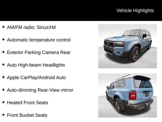 2025 Toyota Land Cruiser 19582.4L 4-Cylinder, alloy Cloth, 6 Speakers, AM/FM radio: SiriusXM, Apple CarPlay/Android Auto, Auto High-beam Headlights, Auto-dimming Rear-View mirror, Automatic temperature control, Exterior Parking Camera Rear, Front Bucket Seats, Heated Front Seats, Wheels: 18 x 7J Dark Gray Metallic Alloy.Say Yes to Sullivan! Our Dealer Conveyance fee is only $479!Certification Program Details: CarBravo Limited Bumper-to-Bumper Warranty **12 Months / 12,000 Miles of Coverage from the day you purchase **No Extra Charge included with every eligible vehicle **Covers many major vehicle systems for added peace of mind **All warranty repairs include parts, labor, and towing to the nearest CarBravo dealership (if necessary) 126-Point Multi-Point Inspection **Each vehicle must pass a comprehensive 126-point inspection **Thoroughly checked for safety, performance, and reliability **Ensures the vehicle meets strict quality standards before itâs offered for sale Added CarBravo Benefits **Convenience get warranty repairs done at any CarBravo dealership nationwide **24-Hour Roadside Assistance* help is just a call away, anytime **Courtesy Transportation* if your vehicle needs warranty repair, your CarBravo dealer will make sure you stay on the move