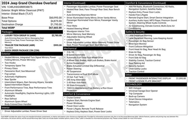 If youâre looking for luxury, capability, and cutting-edge technology in an SUV, this 2024 Jeep Grand Cherokee Overland delivers. Equipped with the Luxury Tech Group IV and Trailer Tow Package, this Grand Cherokee features Nappa leather seating, advanced suspension, and premium comfort features designed for both everyday driving and long-distance travel.